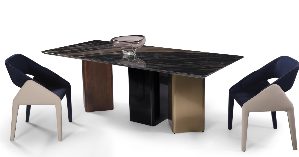 The table legs are designed with a three-color metal splicing, featuring a clever combination of black, brown and gold. This not only ensures stability and load-bearing capacity but also becomes a visual focus, highlighting the exquisite and meticulous craftsmanship of Italian design. Paired with modern two-tone dining chairs, they offer a comfortable sitting experience with ergonomic design. The striking color contrast of deep blue and beige complements the dining table perfectly, enhancing the overall spatial layering.