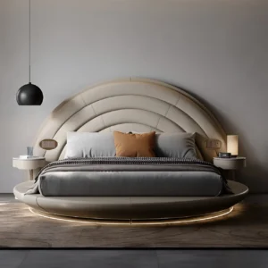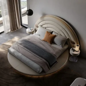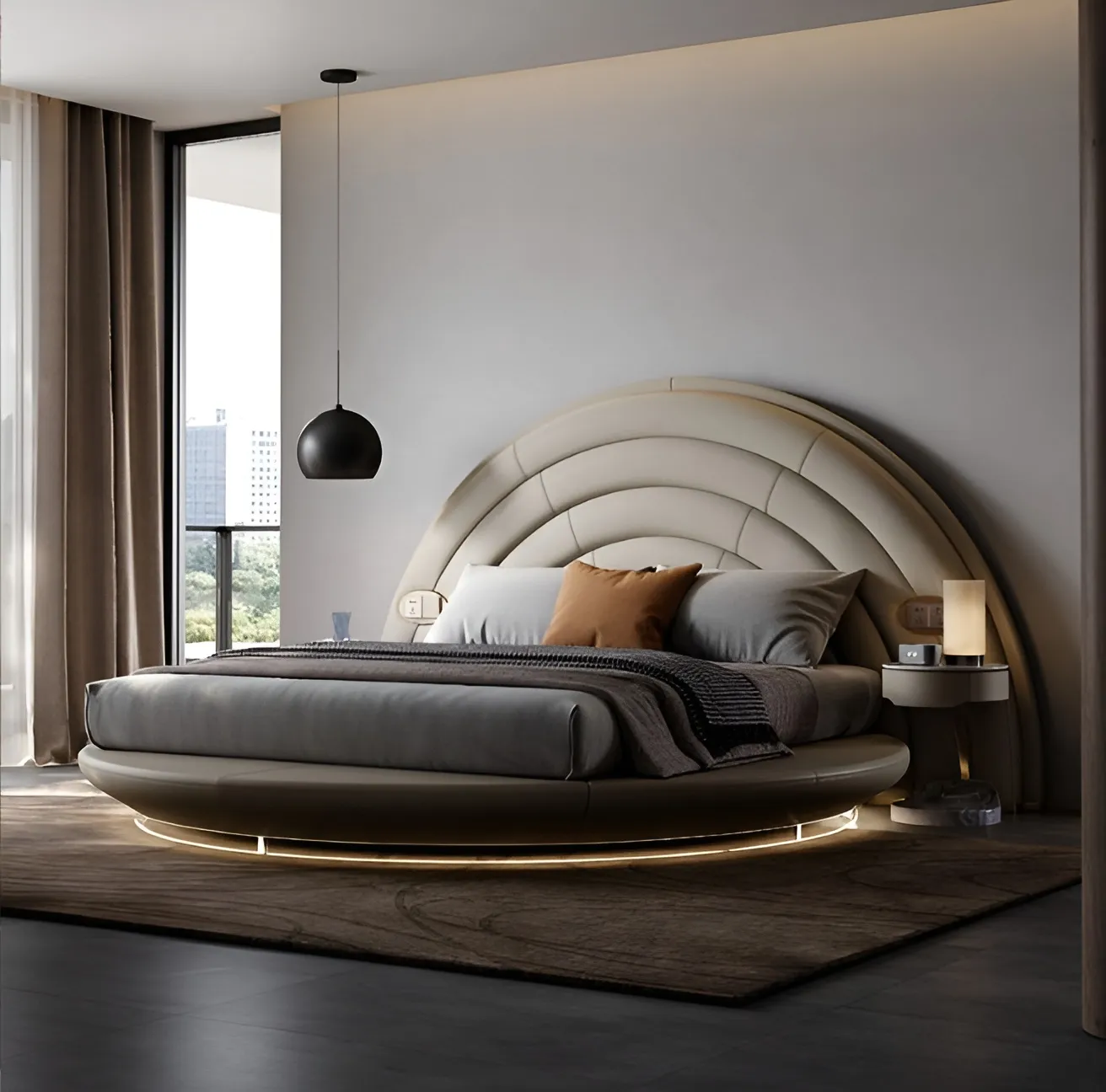 Welcome to our exquisite modern luxury round bed. It seamlessly combines style, comfort and innovative technology. This round leather bed features a unique floating platform design, combined with integrated LED lighting and a stylish curved headboard. It is the ideal core furniture for your luxurious bedroom.