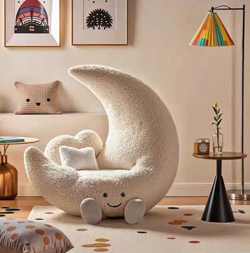 Moon-shaped design, teddy fur fabric, smiling expression decoration, comfortable lazy sofa function, cream style aesthetics