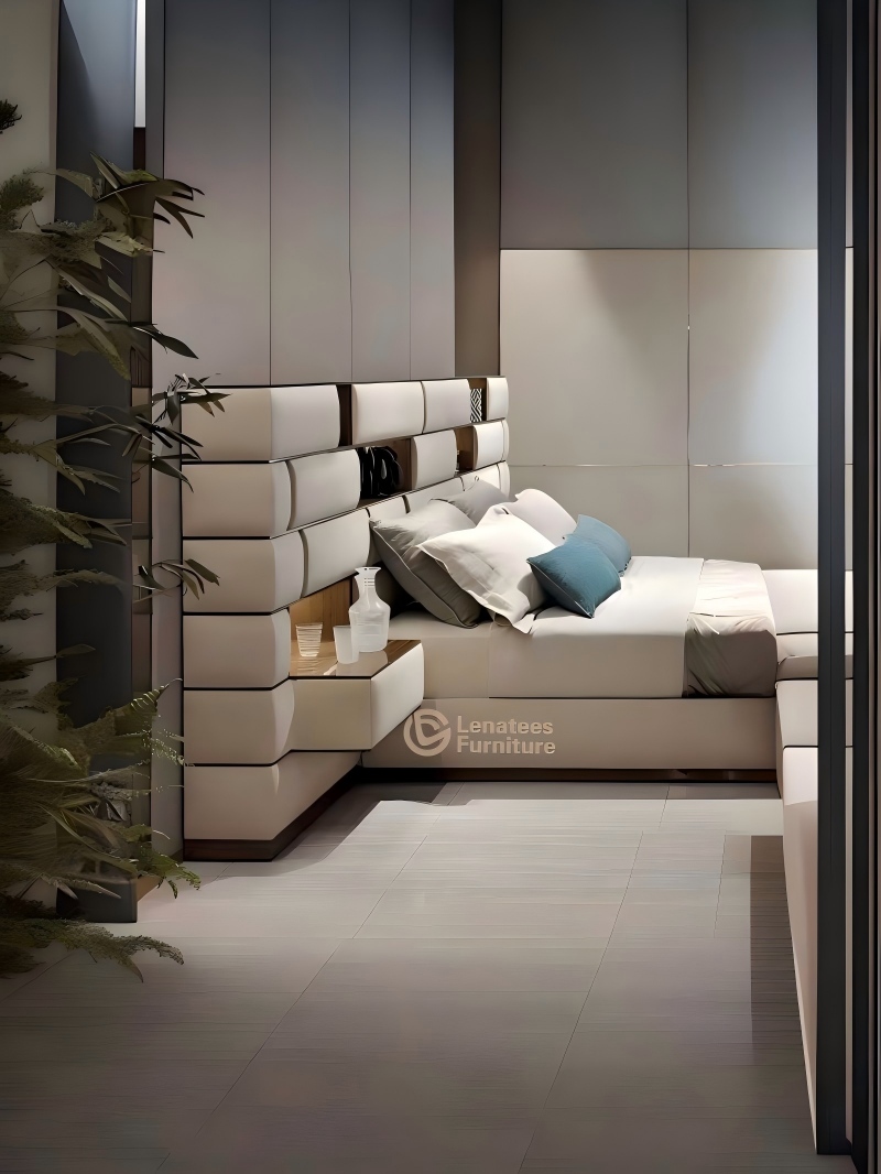This luxury bed features a bold headboard with refined metal accents — blending comfort, craftsmanship, and contemporary design.